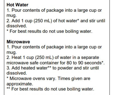 - Pour contents of one pouch into a large cup. Add 1 cup of hot water